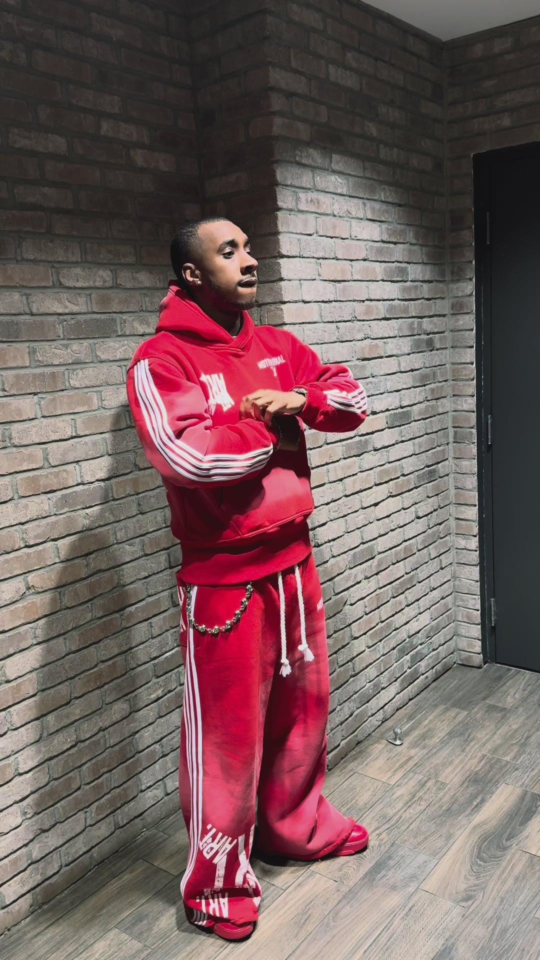 The oversized flare-bottom pants, complete with a thick waistband and unique four-line drawstrings, deliver both comfort and standout style. Paired with the high-pocket hoodie, this vibrant red set exudes energy and confidence, perfect for any occasion.